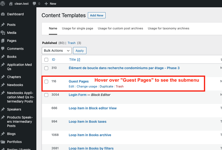 Solution: Use the Duplicate feature in the Content Templates list to create a clone of an existing template. Hover over the CT title to see the Duplicate link.