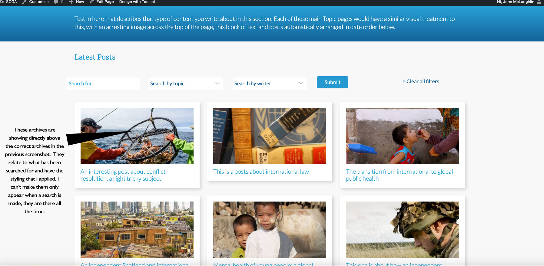 Hi, as you can see on the attached files, the search archives are there at all times on the page. They appear directly above the links to the posts which you can see on the attached 1.jpg. This is a mockup of how I want it to look. 2.jpg shows the archives that have been generated by the Toolset search bar.