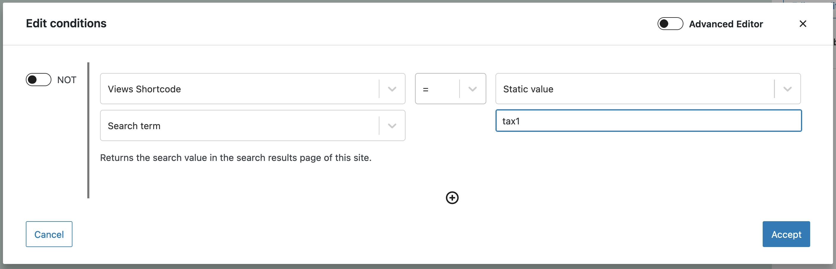 So, add a Conditional block and for the condition choose Views Shortcode > Search term and compare to the static value "tax1". (See screenshot.)