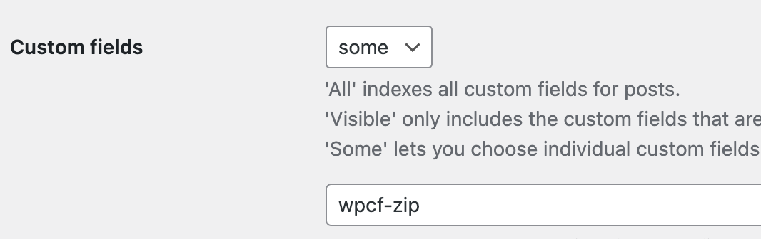 3. Under Relevanssi > Indexing > Custom Fields we've selected "some" and pasted our field name