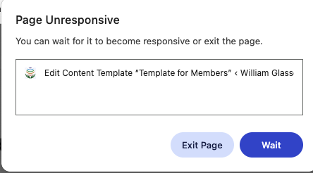 I am trying to use Toolset to edit the Toolset template for a CPT content template. The page is unable to be edited as the page can not be fully loaded. The browser just hangs or give an error with the option to wait or abort.