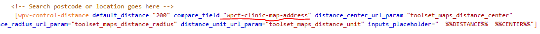 [wpv-control-distance ... compare_field="clinic-map-address" ...]