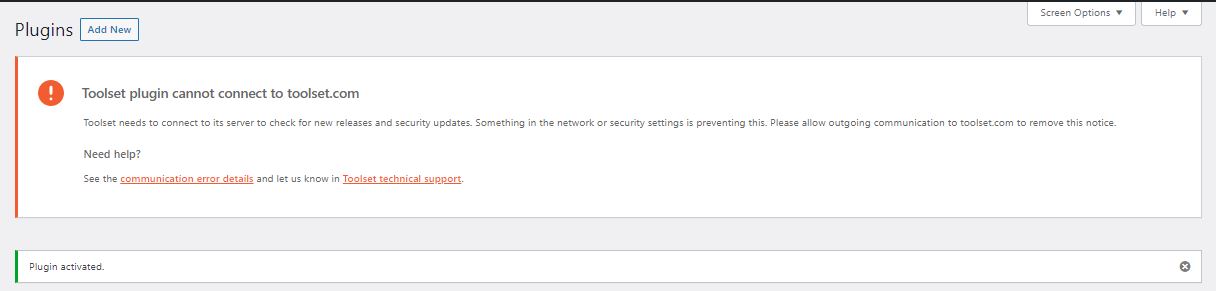 Toolset needs to connect to its server to check for new releases and security updates. Something in the network or security settings is preventing this. Please allow outgoing communication to toolset.com to remove this notice.