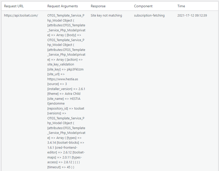 In the installer support log it checks ok in WPML API server, Toolset API server, cURL and simpleXML - but the log stil says "Site key not matching" with the argument: (See attached)