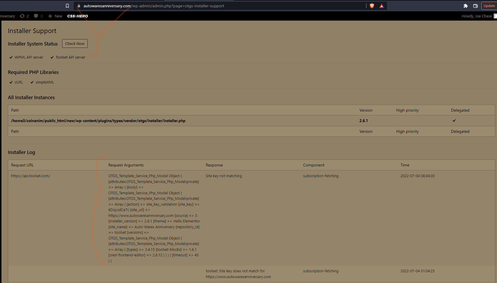 Your webserver can connect with Toolset API server, but there is an error "Site key not matching"