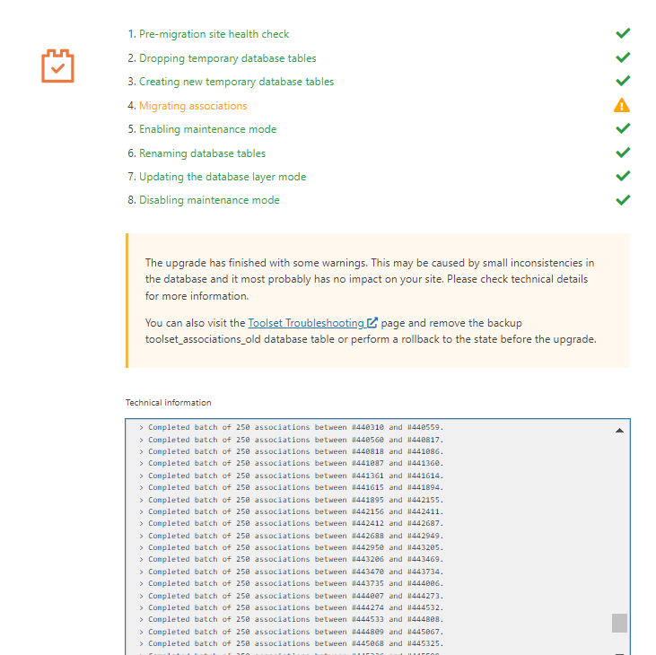 Now i get "Toolset needs to update the database. This will take a few minutes to complete." when i click "update now". it seems to do nothing. Its been more than one hour, still getting same message in the dashboard.