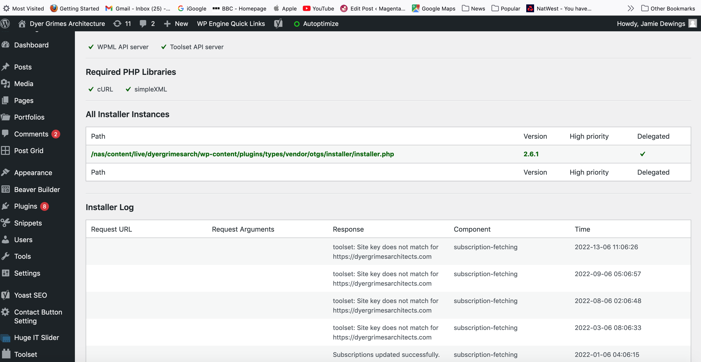 You should now be able to see your site validation information. If you're see "Toolset site key not matching for hidden link" then you will need to regenerate your site as the URL may have changed and your key isn't validating for the current URL.