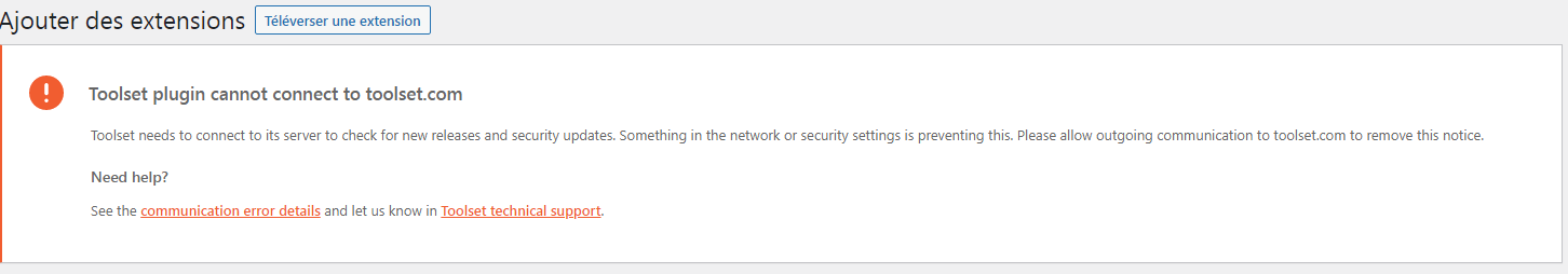 I disabled toolset and then enabled again. There is always the message "Toolset plugin cannot connect to toolset.com"