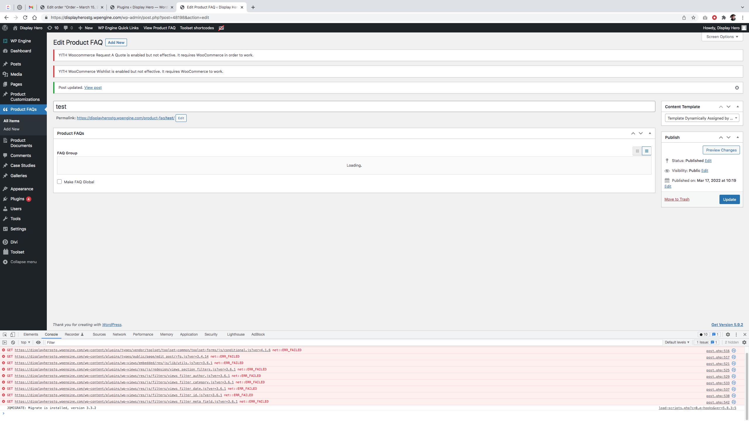 I tested the same Product FAQs from your screenshot and was able to update it without any errors. Are you still seeing those errors and if yes, can you please share the exact steps?