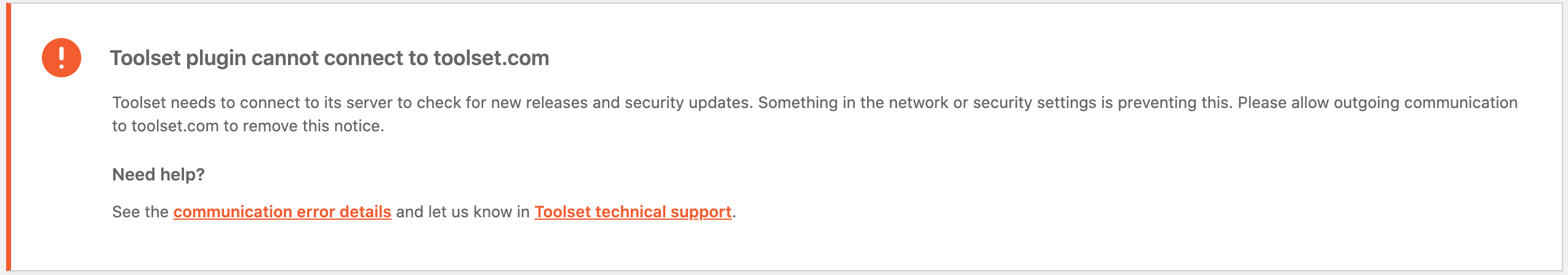 Hi, Shane is unavailable today so I'm checking in on his outstanding tickets. I hope that's okay. I can see in your account information a site key registered for hidden link;, but it looks like your screenshots are taken on hidden link or maybe hidden link. Your final site domain must be identical to the registration key domain, otherwise you'll see an error when trying to register or connect. If you're using Toolset in a development environment with a different URL from the URL used to register the key, the plugins will continue to work as expected but you won't be able to register and get automatic plugin updates in the development site. You must install and update Toolset plugins manually in the dev environment in this case, or temporarily unregister the live site URL and register the dev site URL to enable automatic updates in dev. Current Toolset plugins are available for download in the Downloads area here: https://toolset.com/account/downloads
