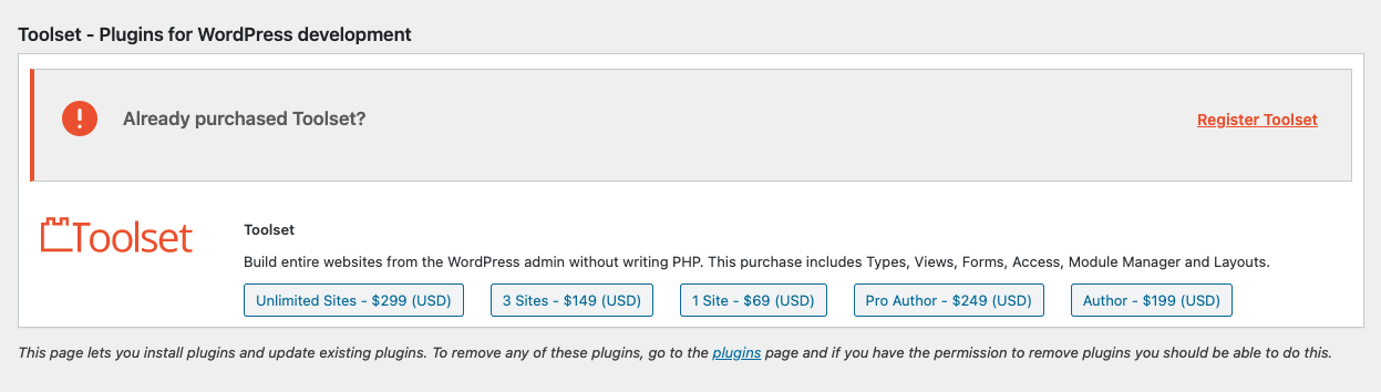 - Scroll down to the Toolset installer panel and click "Unregister Toolset from this site" if the plugins are already registered (for instance if you migrated from a staging site). After that the page will reload.
