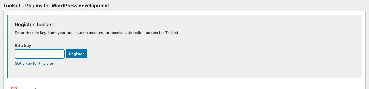 - Return to the Toolset installer in your wp-admin area and paste the key you just copied into the Site key field, then click Register.