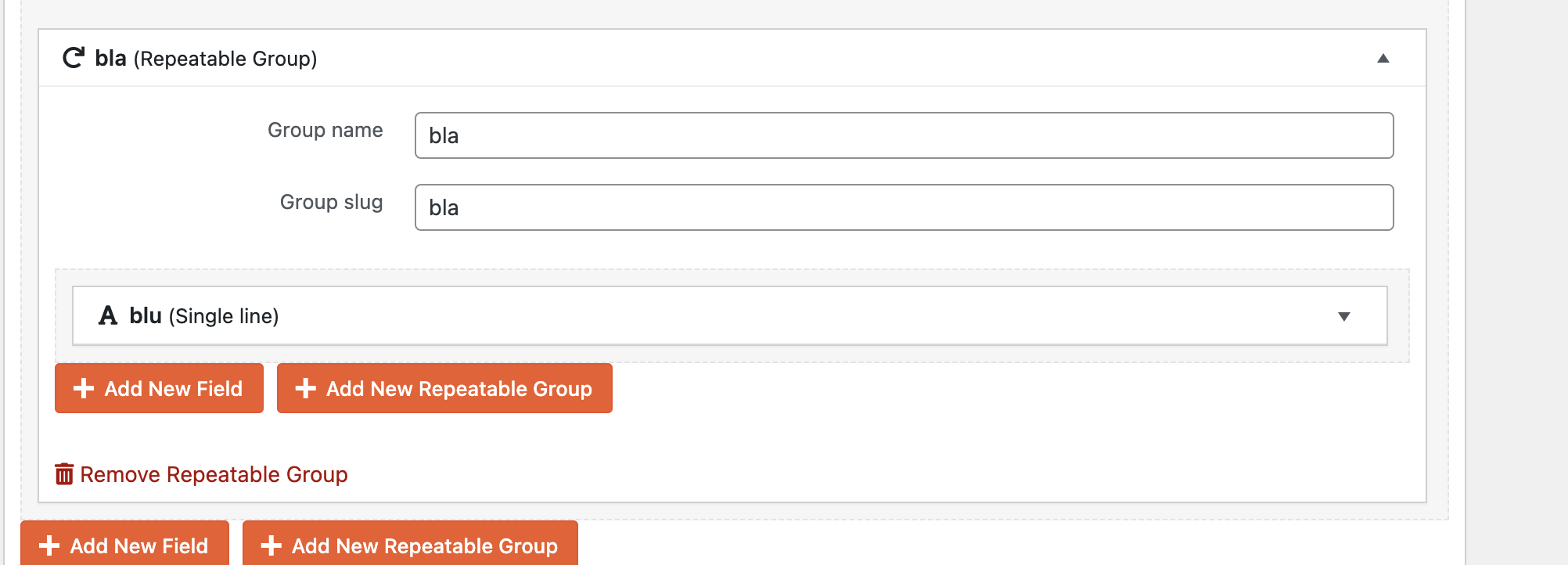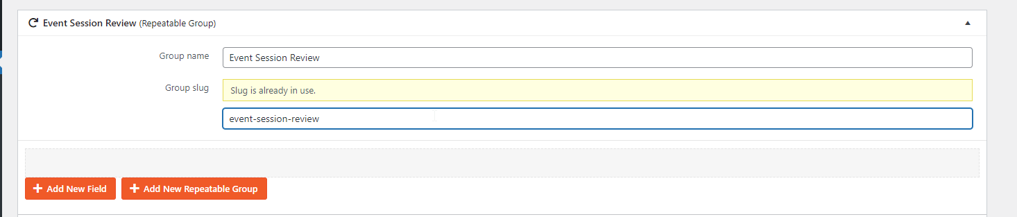 Thank you for the login information. I went to the Event Custom field group which was assigned to the Event post type and added a repeatable field group named Bla and added a single line field named blue.