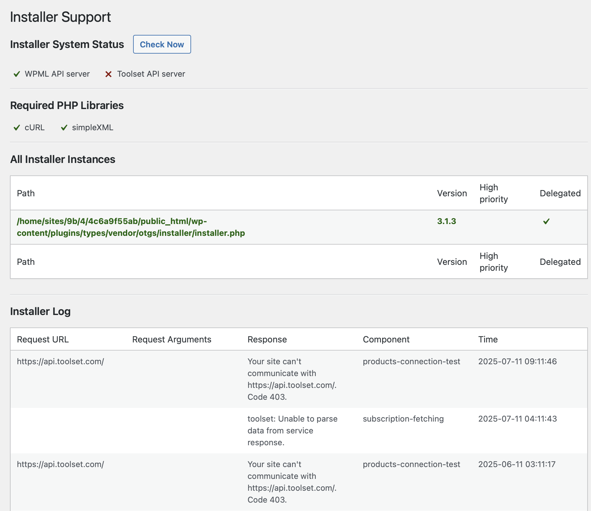 Also, a few of my other sites will not update any of the Toolset plugins and I get a "Update failed: undefined" message, and on inspection cannot communicate with the Toolset API server.