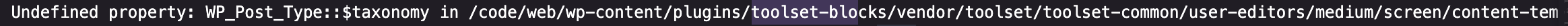 PHP Warning: Undefined property: WP_Post_Type::$taxonomy in /code/web/wp-content/plugins/toolset-blocks/vendor/toolset/toolset-common/user-editors/medium/screen/content-template/frontend.php on line 60