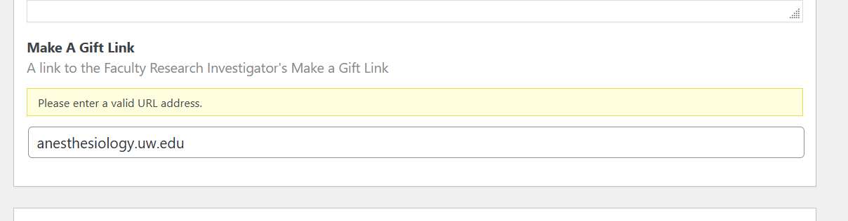 I expected to see: That it allows for someone enter a URL without https. For example if a user entered anesthesiology.uw.edu in the URL form input it should work because if you copy and paste that exact url in your browser it will still go to the same website.