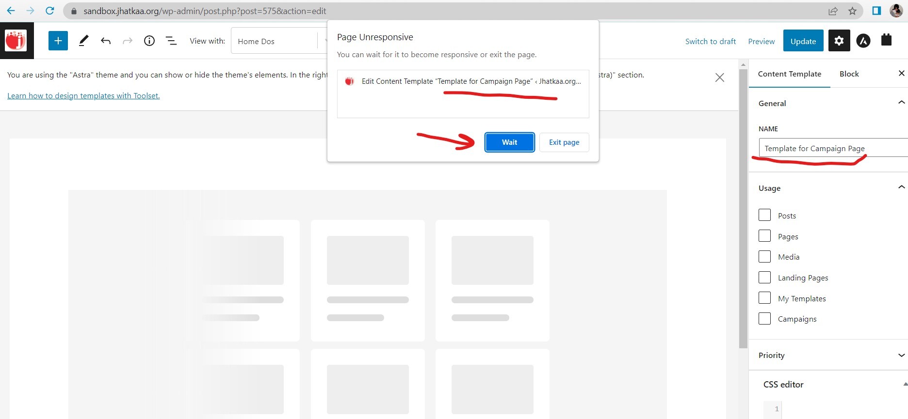 We have Toolset running on sandbox.jhatkaa.org. When I go to 'Toolset > Content Templates' in my wp dashboard and open a template named "Template for Campaign Page" that I created, my browser hangs. The ID of this content template is 575.