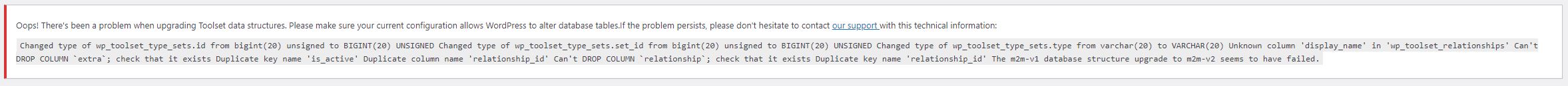 Changed type of wp_toolset_type_sets.id from bigint(20) unsigned to BIGINT(20) UNSIGNED Changed type of wp_toolset_type_sets.set_id from bigint(20) unsigned to BIGINT(20) UNSIGNED Changed type of wp_toolset_type_sets.type from varchar(20) to VARCHAR(20) Unknown column 'display_name' in 'wp_toolset_relationships' Can't DROP COLUMN `extra`; check that it exists Duplicate key name 'is_active' Duplicate column name 'relationship_id' Can't DROP COLUMN `relationship`; check that it exists Duplicate key name 'relationship_id' The m2m-v1 database structure upgrade to m2m-v2 seems to have failed.