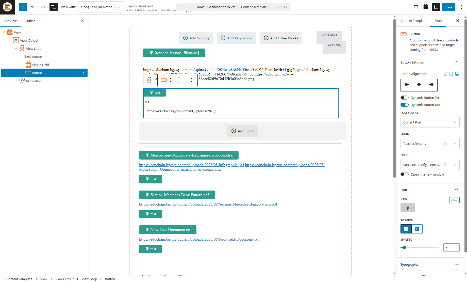 I would like to know - are you using blocks to display the file field or classic view shortcodes?