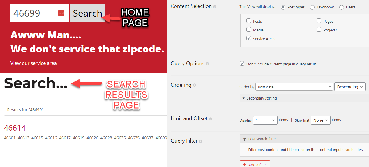 I am trying to: Change from having the wpv-filter-search-box filter only searching titles to also searching contents. I've changed the option on the view and it shows "Filter post content and title based on the frontend input search filter." More information: my service areas are titled by zipcodes. People put in their zipcode and it tells them if it is serviceable and links to service area page. We now have service areas for cities that have multiple zipcodes so I'm trying to put the extra zipcodes in the content of the post so it shows as serviceable.
